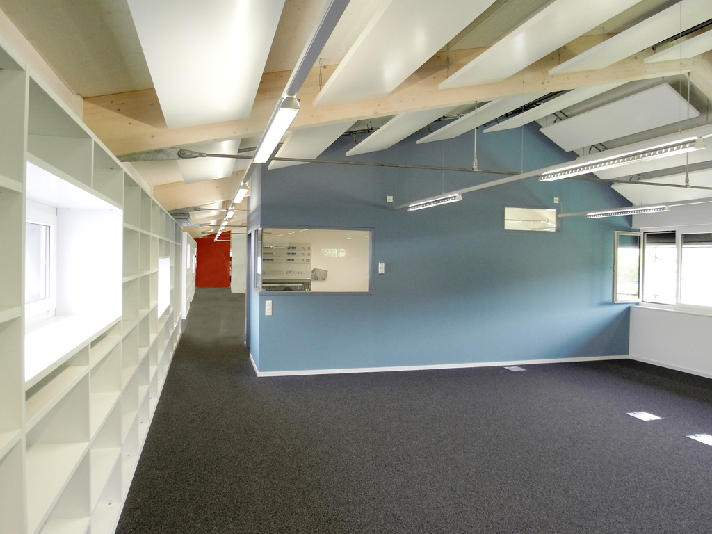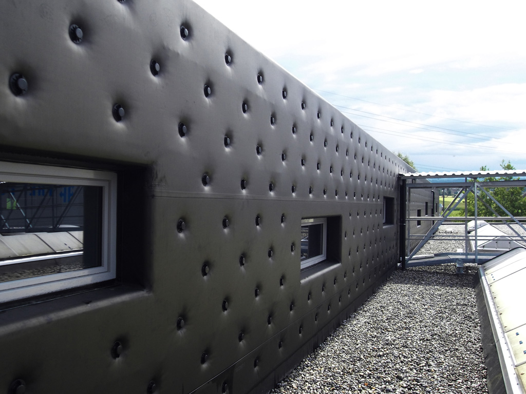 Aufstockung einer bestehenden Halle, Aussenhülle inkl. Dach aus EPDM (Sofa-Effekt), Ausführung in Elementbau mit kurzer Bauzeit.