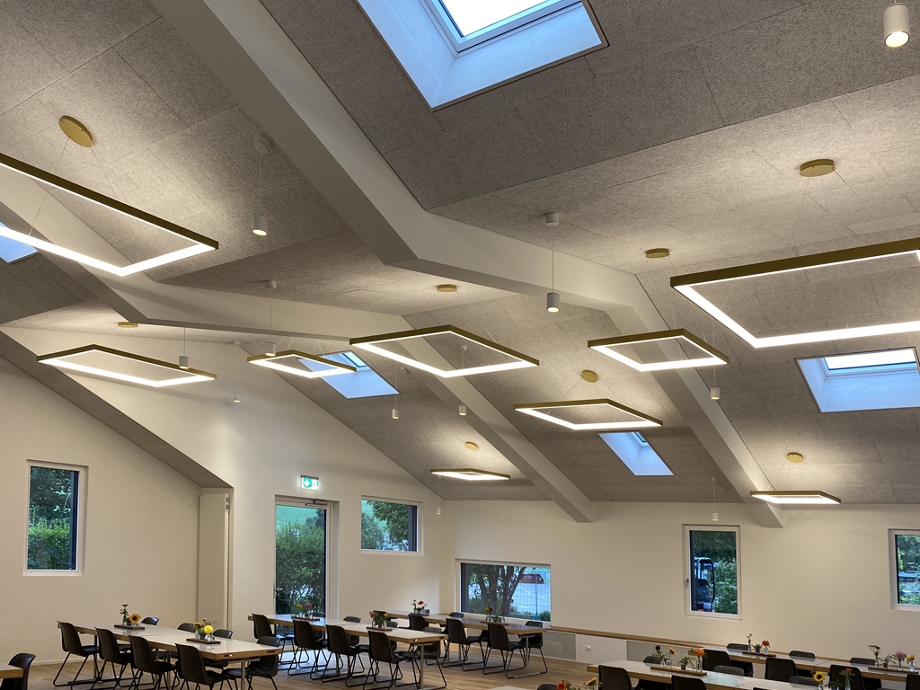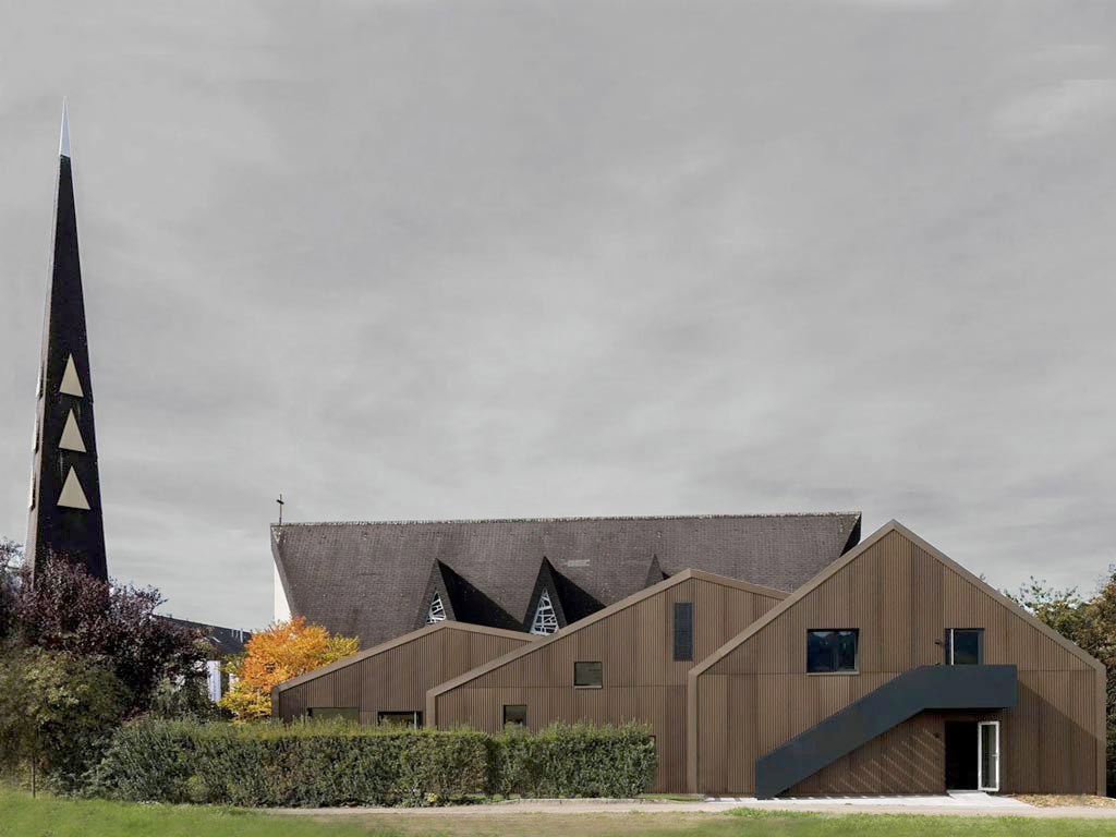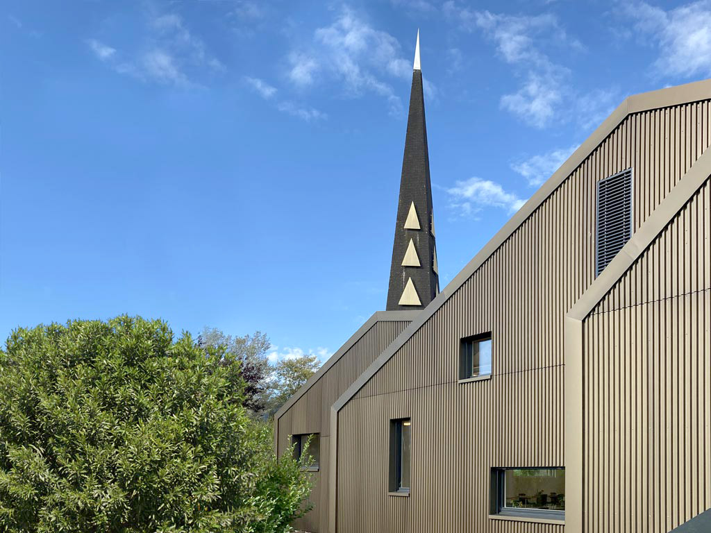 Gemäss Wettbewerbsausschreibung sollte ein neuer Kirchgemeindesaal mit Schulungsräumen und Gemeindeverwaltung zu der bestehenden Anlage geplant werden. Das ehemalige Pfarrhaus wurde nicht mehr genutzt und konnte entsprechend in die Planung integriert werden. Das bestehende Pfarrhaus wurde im umgesetzten Projekt vollumfänglich für die neuen Nutzungen integriert. Der Anbau des Gemeindesaals mit zwei aufbäumenden Satteldächern bezieht sich auch auf den Namen der denkmalgeschützten «Kirche zur Auferstehung». Der Neubau in Holzrahmenbauweise und das bestehende Pfarrhaus wurden einheitlich materialisiert. Das skulpturale Gebäude schafft ein neues Ensemble mit der Kirche und dem Zwischenbau. Das Projekt nimmt Rücksicht auf das bestehende Kirchgemeindezentrum. Der grössere Pfarreisaal für ca. 120 Personen ist als neuer Anbau zusammen mit dem ehemaligen Wohnteil mit genügend Abstand zum Kirchenschiff geplant.