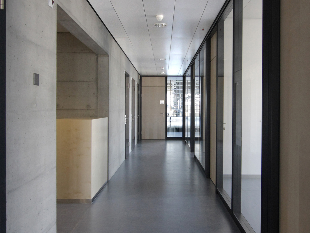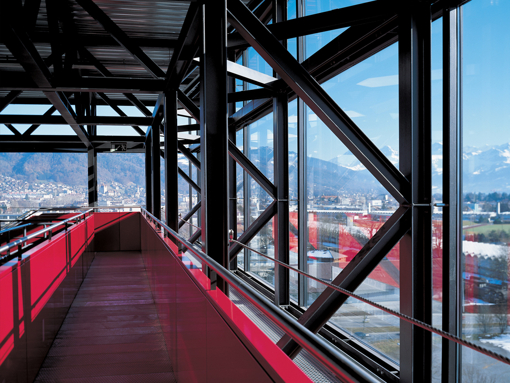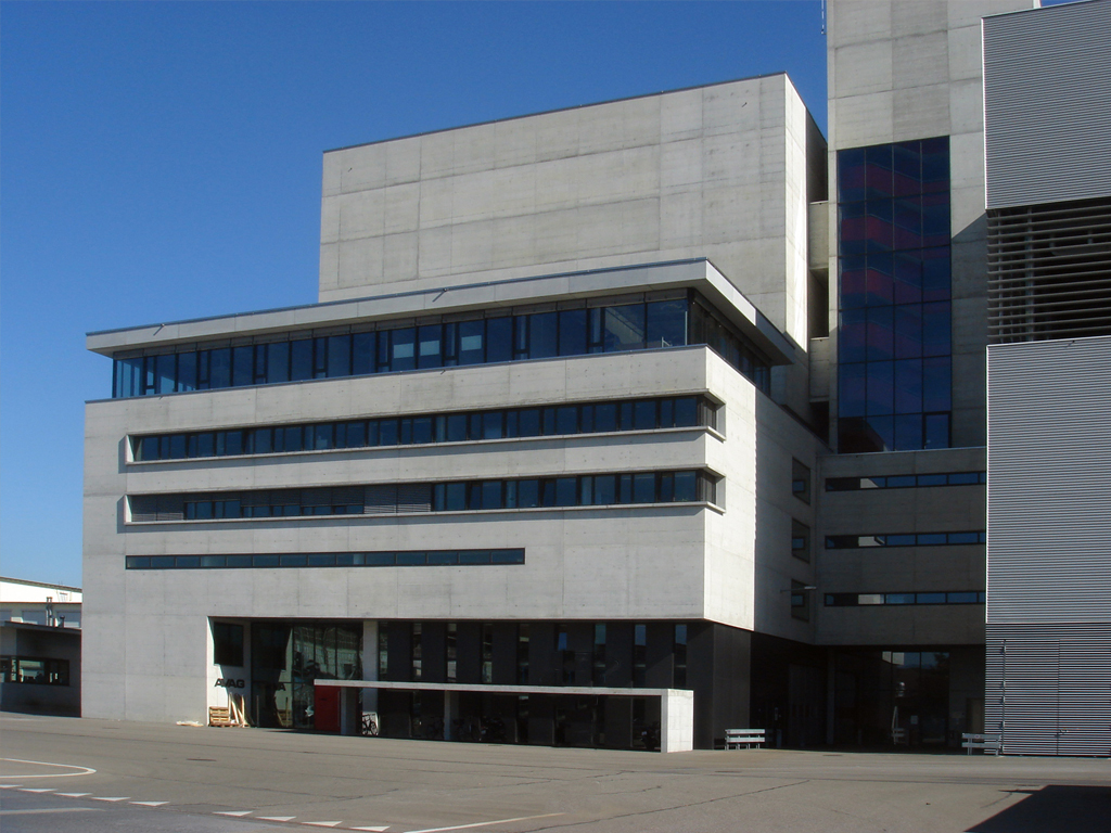 Eingeschossiger Hallenteil als Stahlkonstruktion mit 4 Autoliften und Grube für Lastwagen. Dreigeschossiger Servicebereich mit Empfang, Büros, Lager und Sozialräume. Fundation mit Micropfählen.