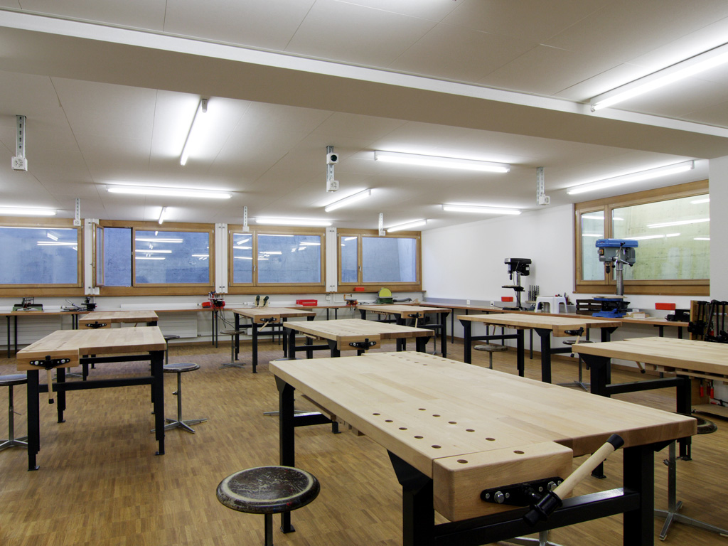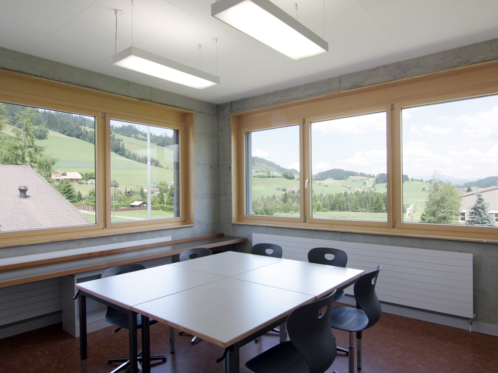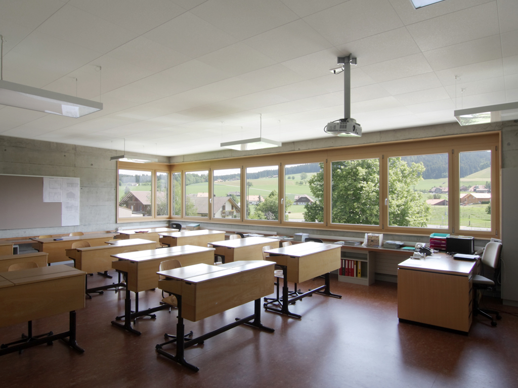 Das im 1. Rang gewonnene Wettbewerbsprojekt beinhaltete ursprünglich den Erweiterungsbau des bestehenden Schulgebäudes sowie einen Verbindungsbau zum Mehrzweckgebäude. Aufgrund begrenzter finanzieller Mittel der Gemeinde musste das Raumprogramm jedoch auf letztlich zwei neue Klassenzimmer, vier Gruppenräume sowie einen Werkraum reduziert werden.