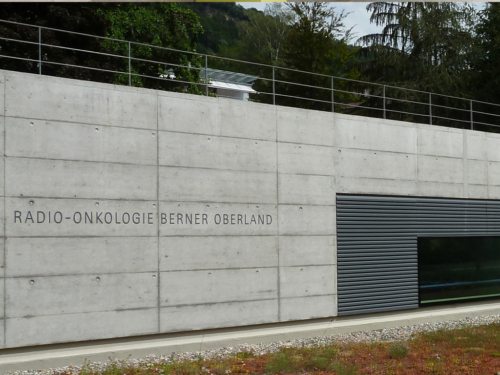 Neubau der Radio-Onkologie Berner Oberland. Hochkomplexe technische Einrichtungen und anspruchsvolle Bautechnik (Strahlenschutz) treffen auf die Bedürfnisse der Patienten, die sich der ambulanten Bestrahlungstherapie zu unterziehen haben. Aufrechterhaltung des Spitalbetriebes während der gesamten Bauzeit.