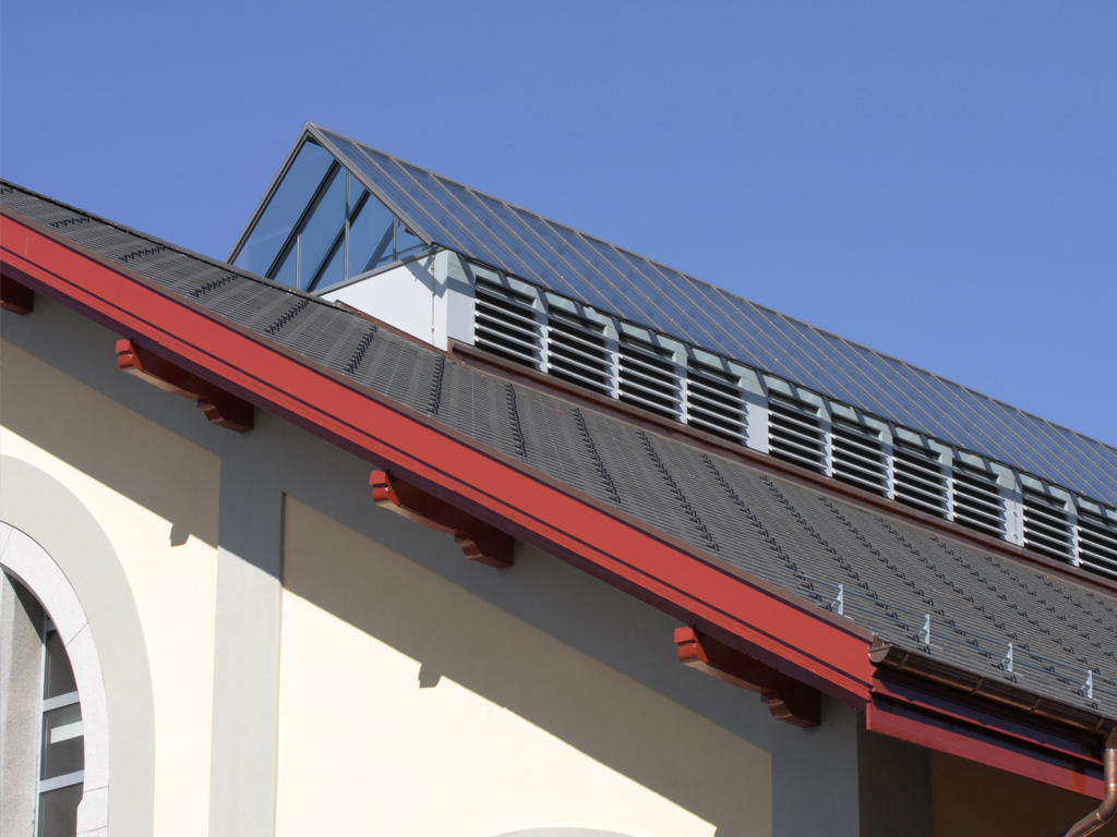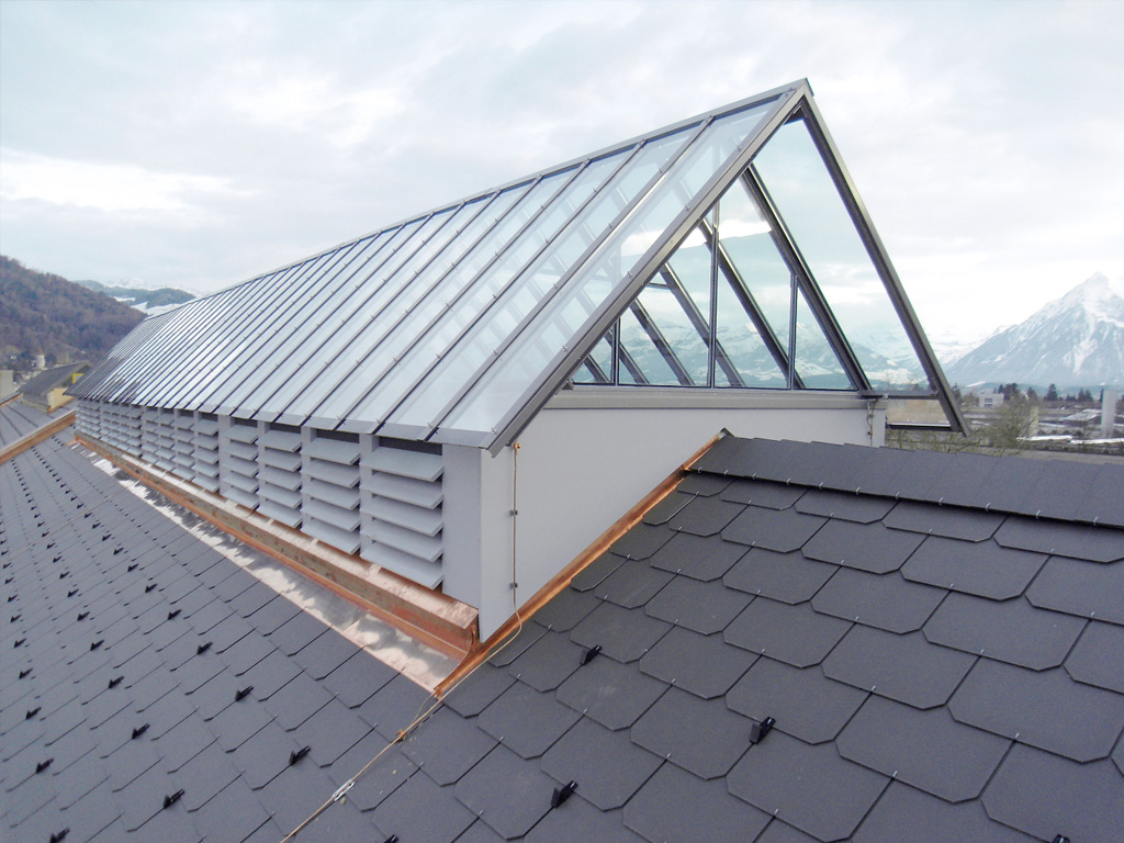 Rekonstruktion der historischen Fassaden- und Farbgestaltung. Anpassung der Dachflächen an aktuelle Wärmeschutzstandards. Isolierverglasung der bauzeitlichen Stahlkonstruktionen der Dachoblichter.