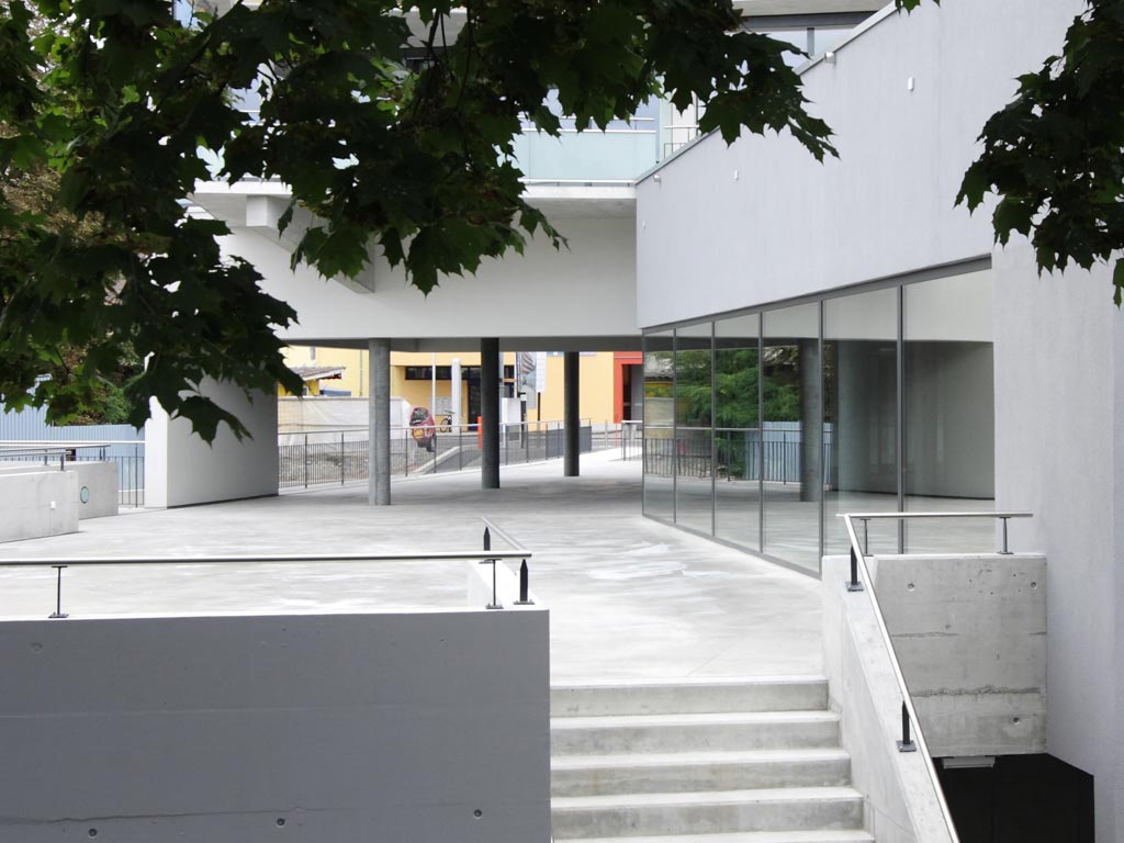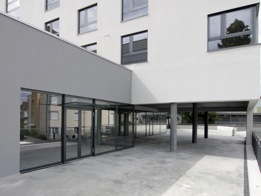 Wohn- und Dienstleistungsgebäude an städtebaulich schwieriger Situation. Lösungsentwicklung in enger Zusammenarbeit mit Planungsbehörden.